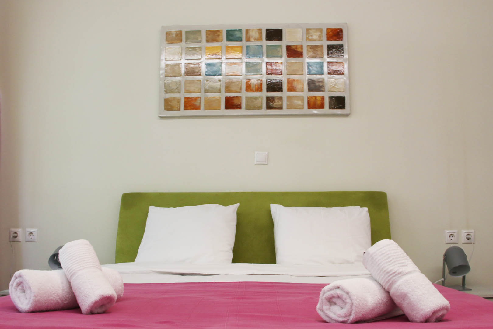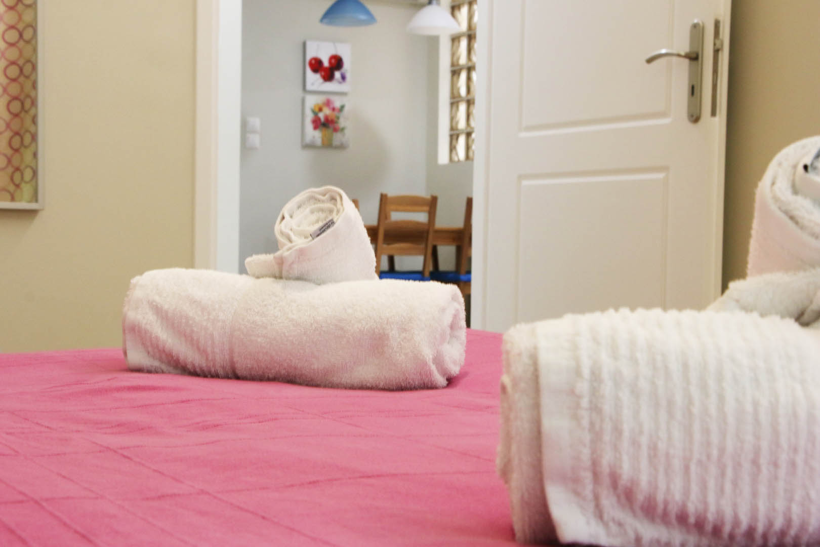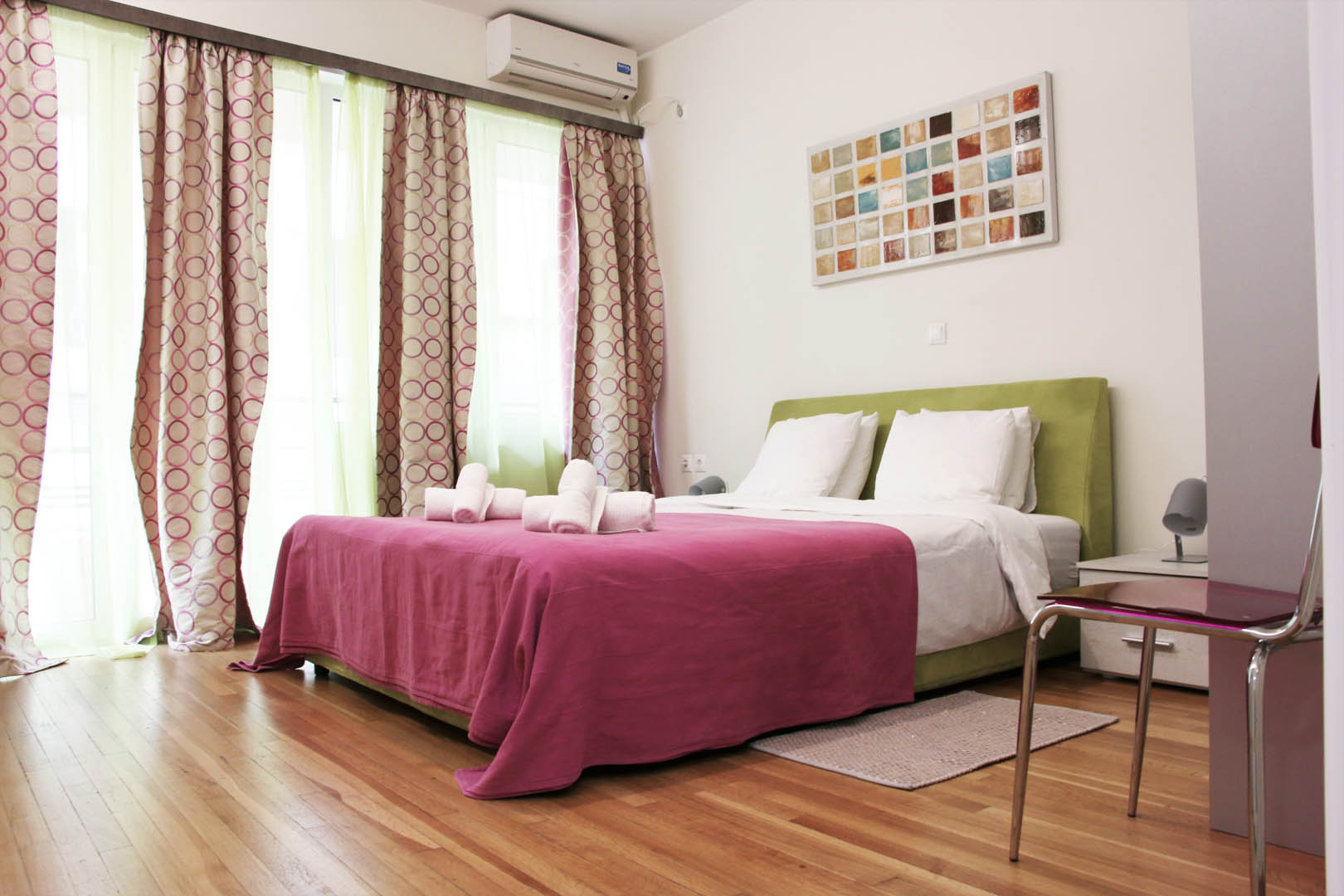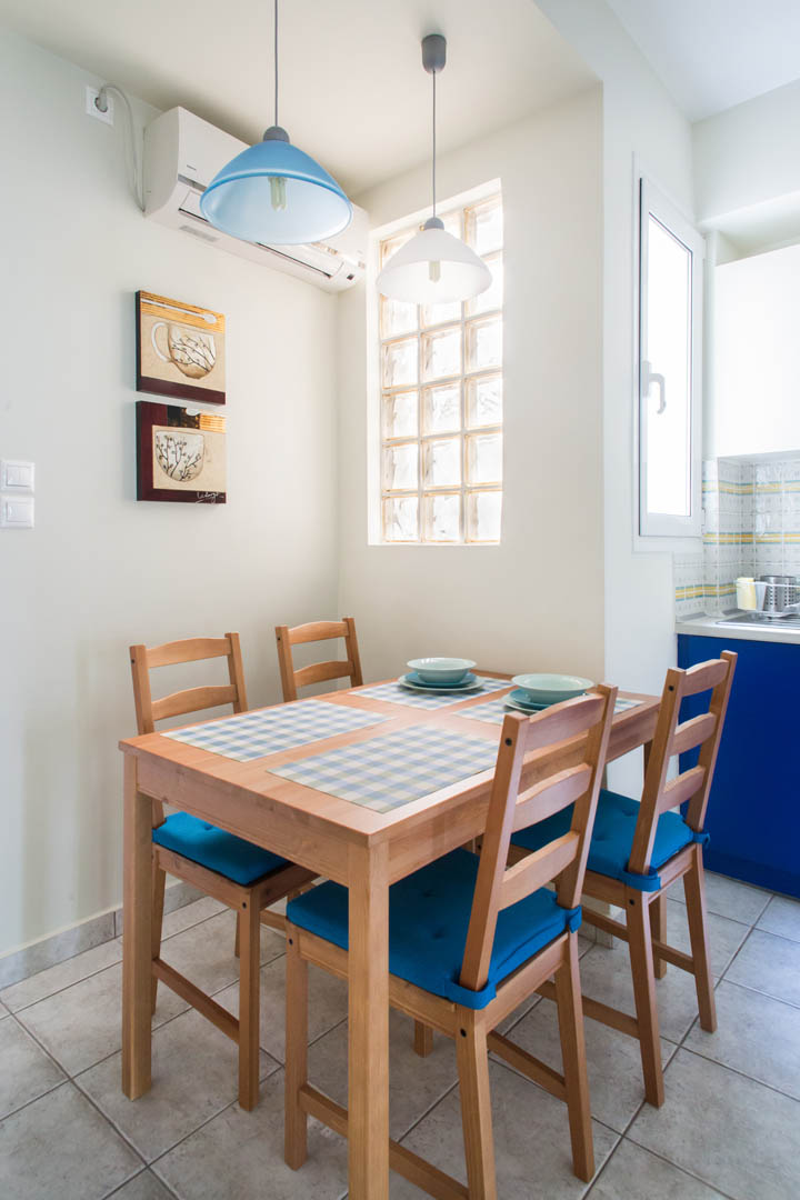 The 60 square meters Apollo Apartment, has one bedroom with a double bed and a living room with a sofa that turns into an extra double bed and it is able to host up to 4 people. The kitchen is fully equipped with everything you may need, such as kettle, oven, fridge etc. In the bathroom you’ll find a shower, hair dryer, towels and toiletries.