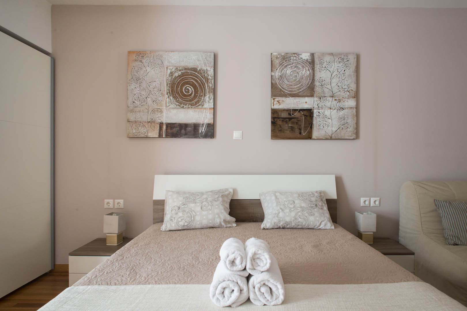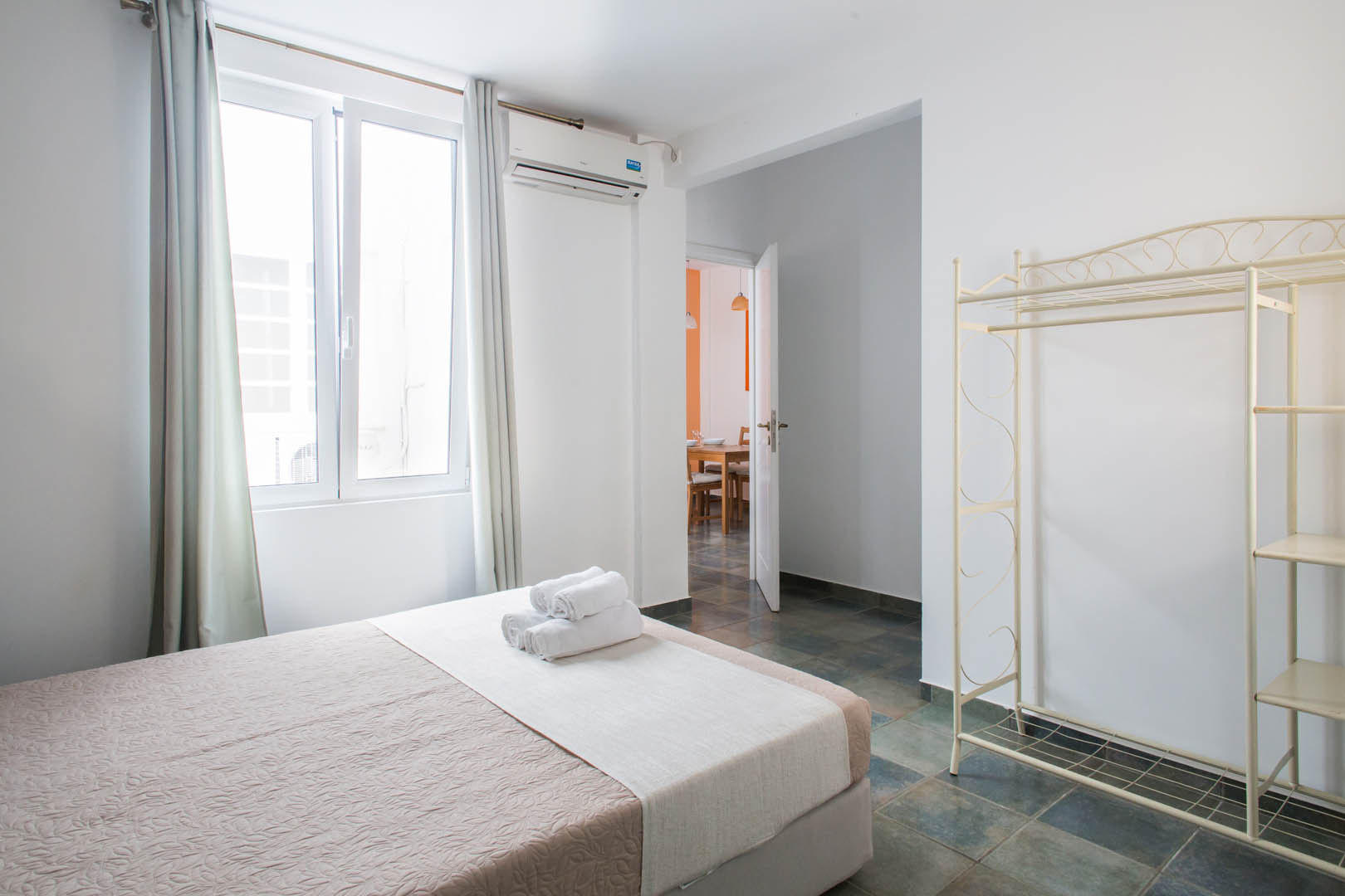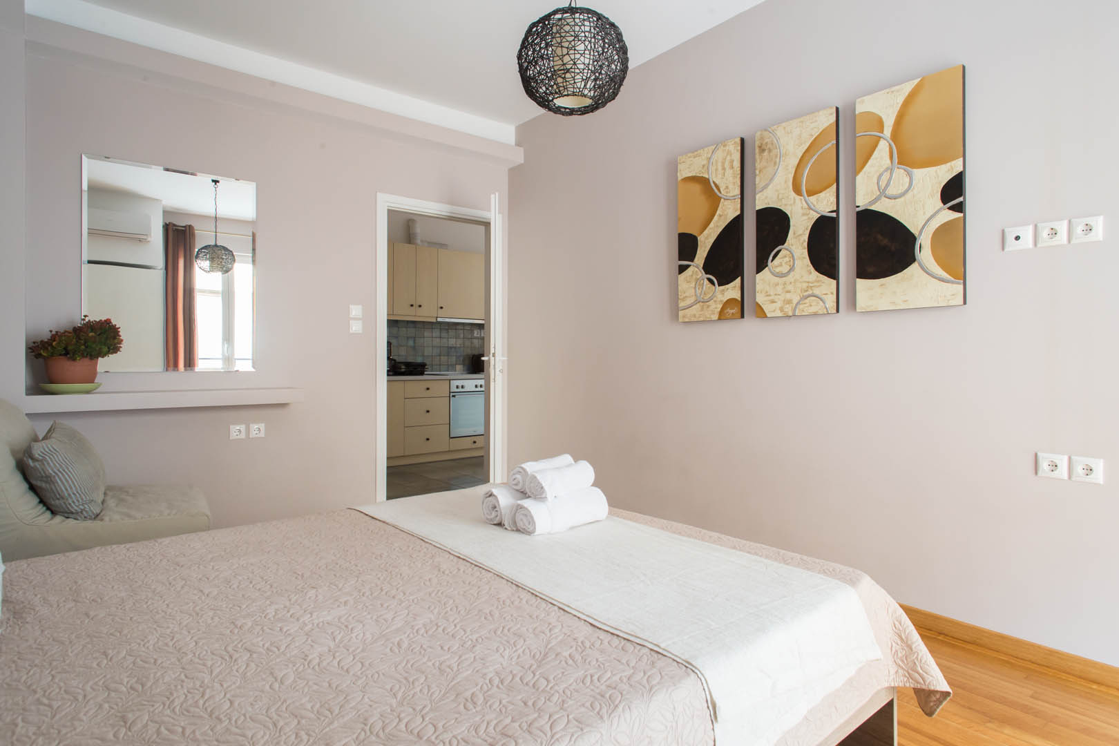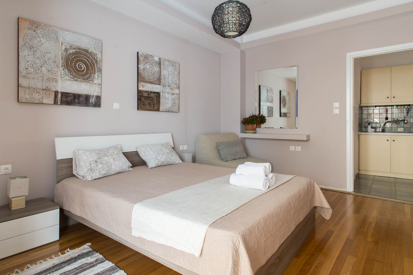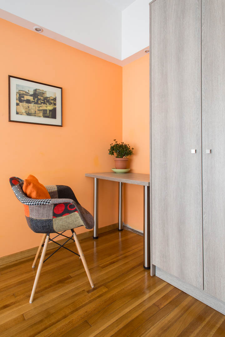 The 82 square meter Hera Apartment, has two bedrooms, each one featuring a double bed, while one of them has a private bathroom with shower and the other one an armchair – bed. In the living room there’s an extra sofa- bed. The apartment also has a fully equipped kitchen and bathroom, a small desk and a balcony.