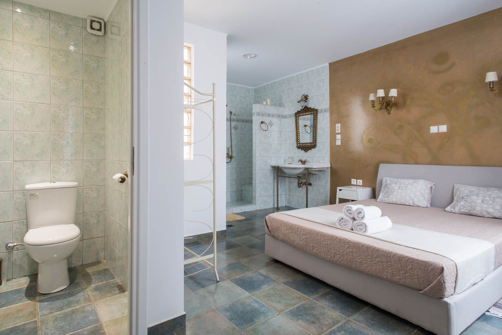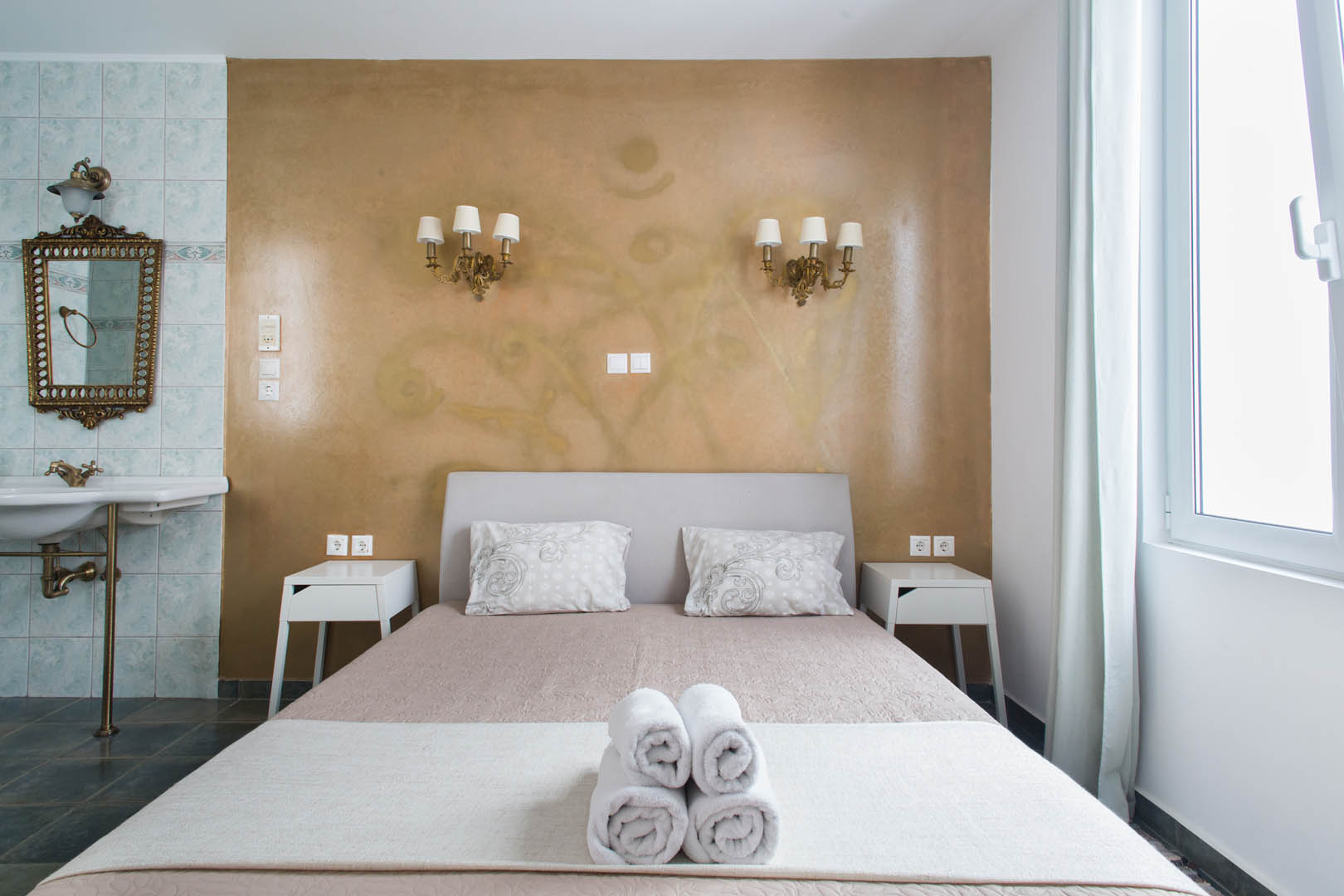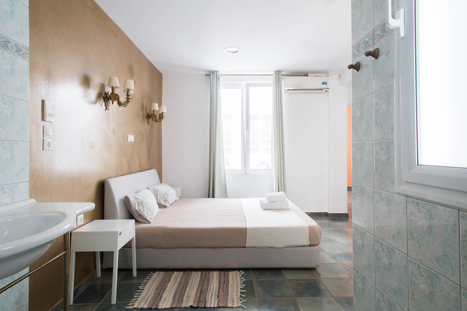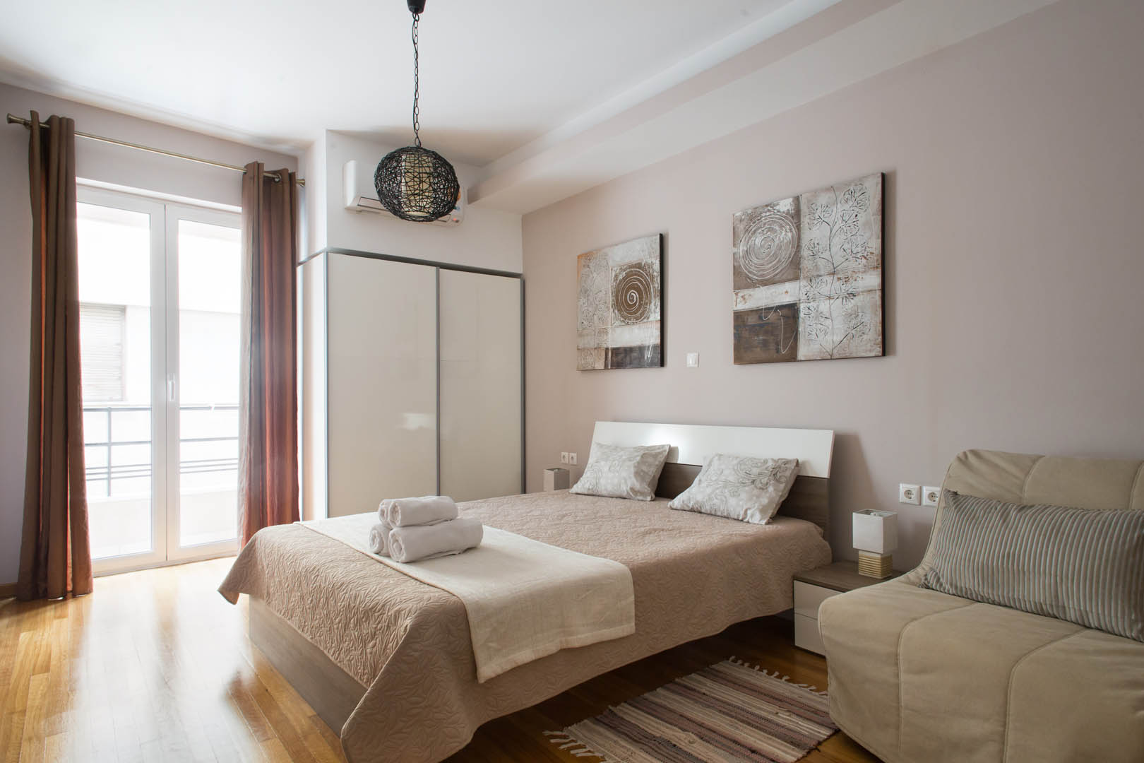 The 82 square meter Hera Apartment, has two bedrooms, each one featuring a double bed, while one of them has a private bathroom with shower and the other one an armchair – bed. In the living room there’s an extra sofa- bed. The apartment also has a fully equipped kitchen and bathroom, a small desk and a balcony.