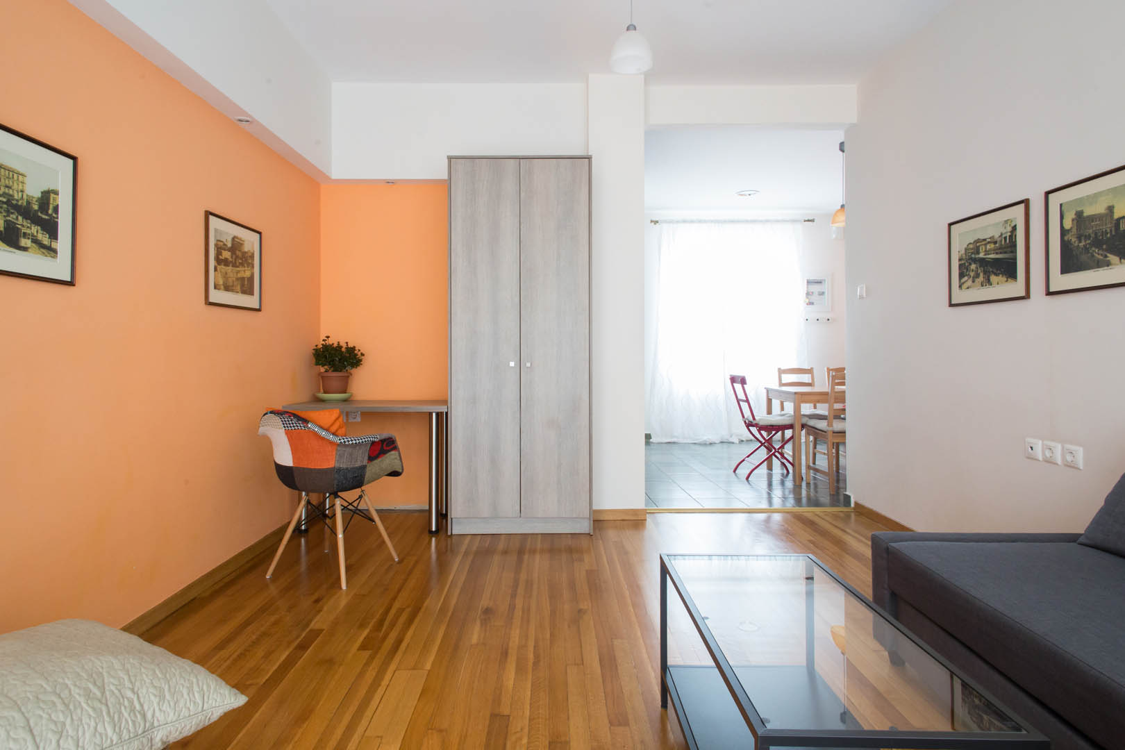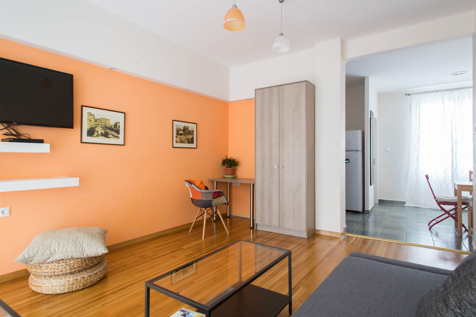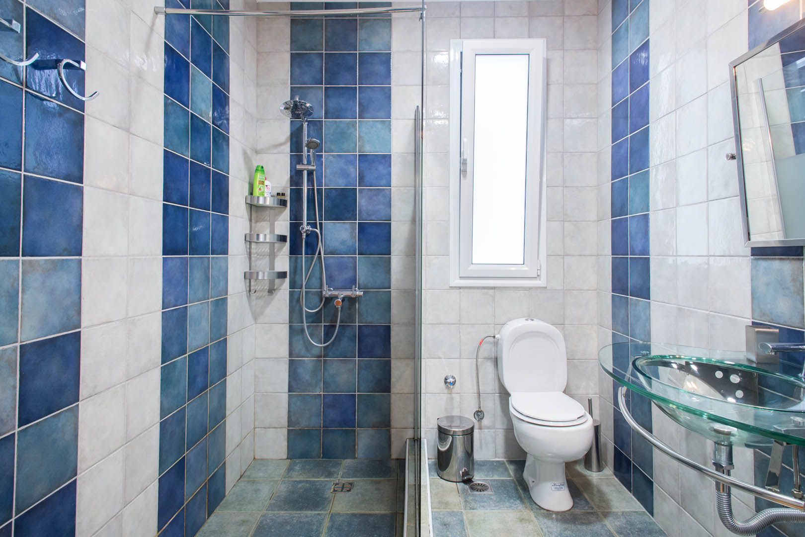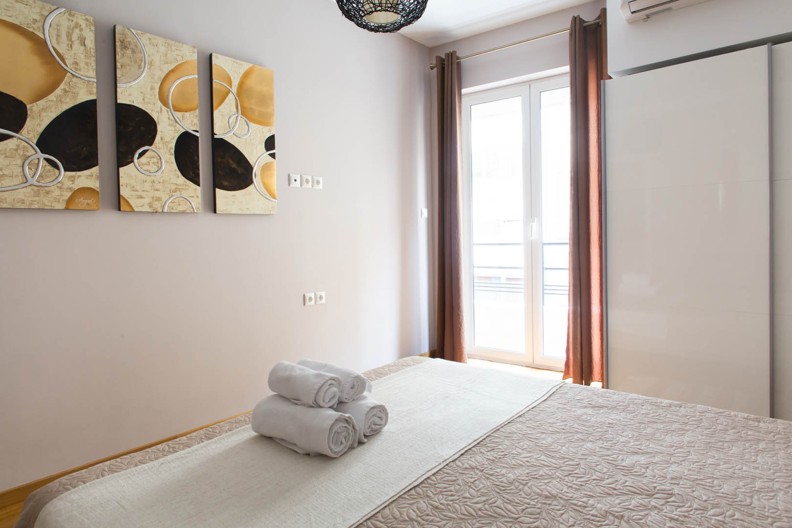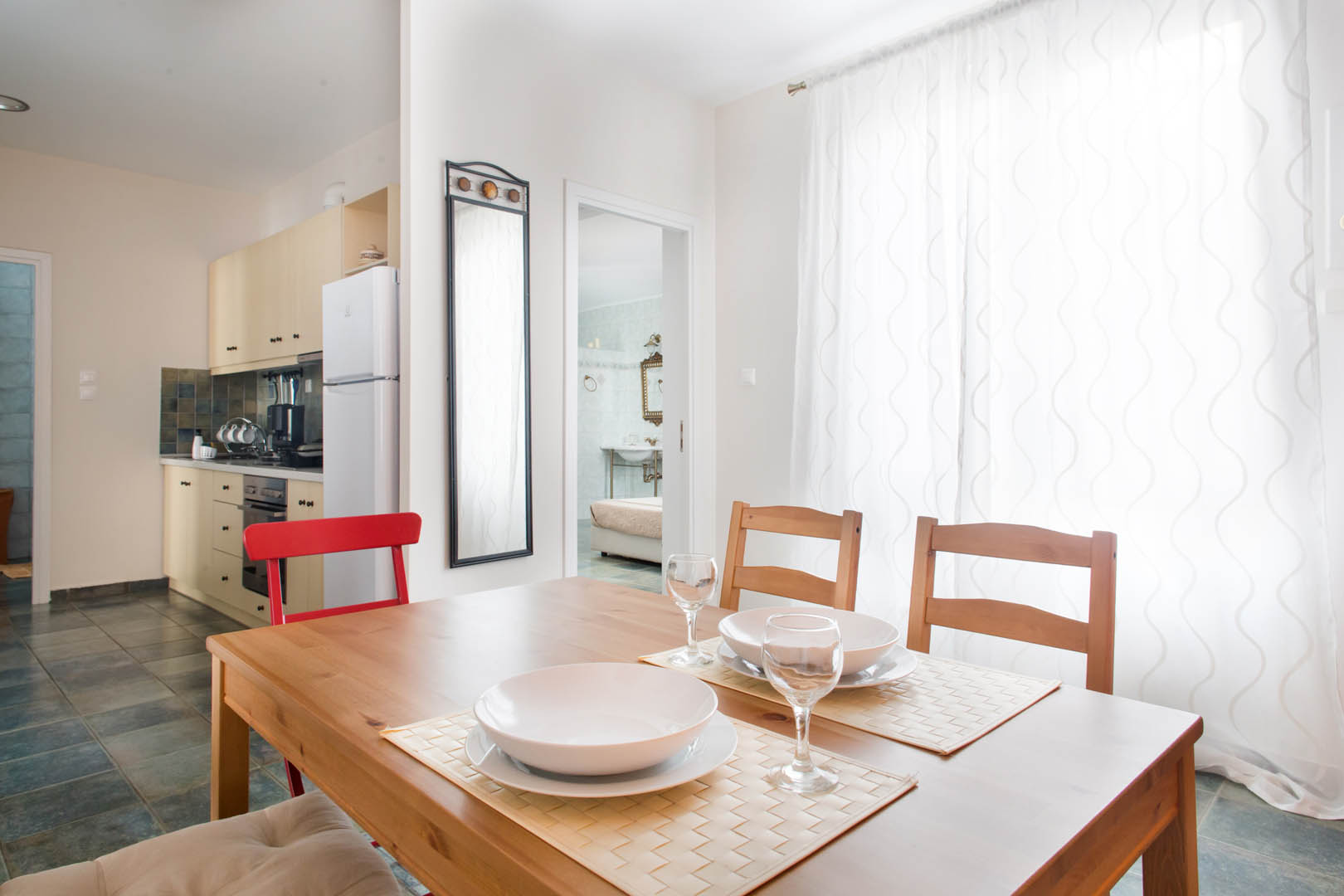 The 82 square meter Hera Apartment, has two bedrooms, each one featuring a double bed, while one of them has a private bathroom with shower and the other one an armchair – bed. In the living room there’s an extra sofa- bed. The apartment also has a fully equipped kitchen and bathroom, a small desk and a balcony.