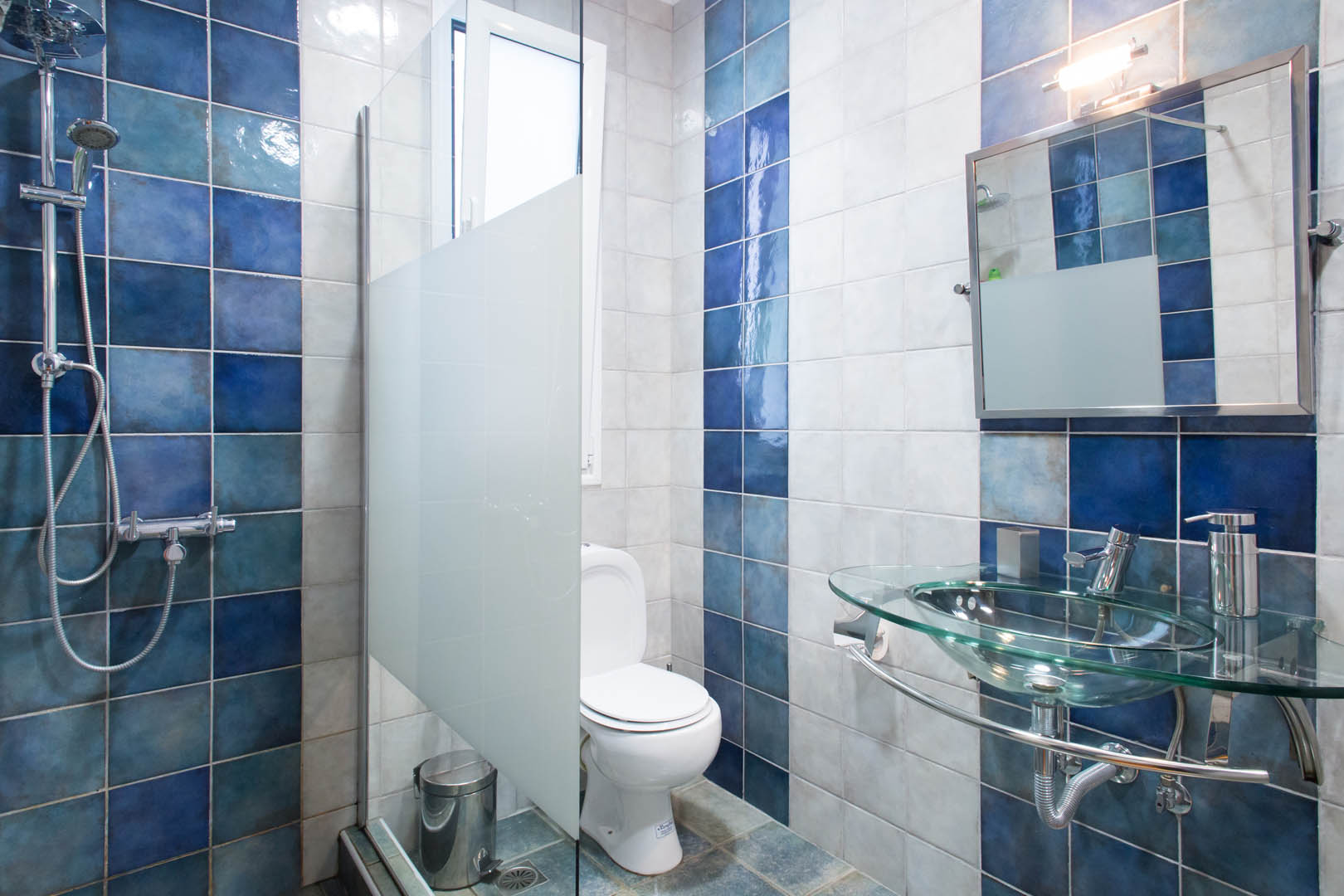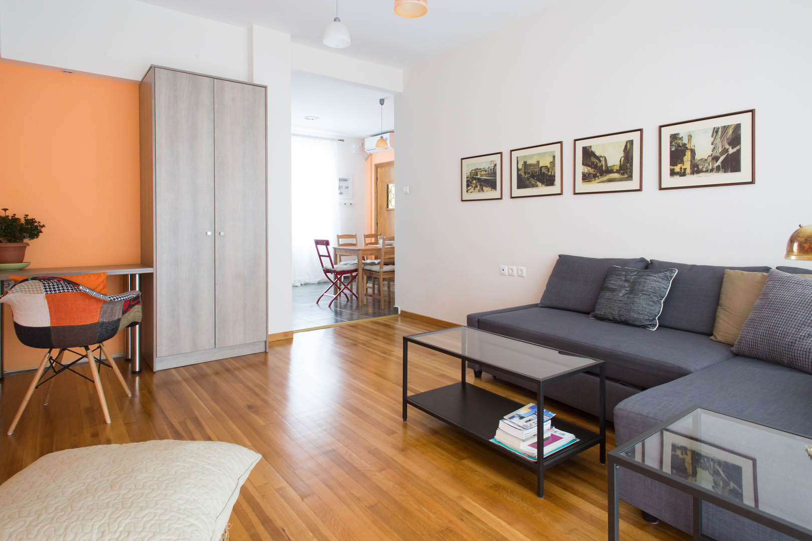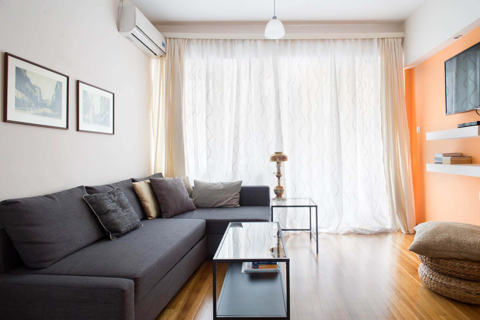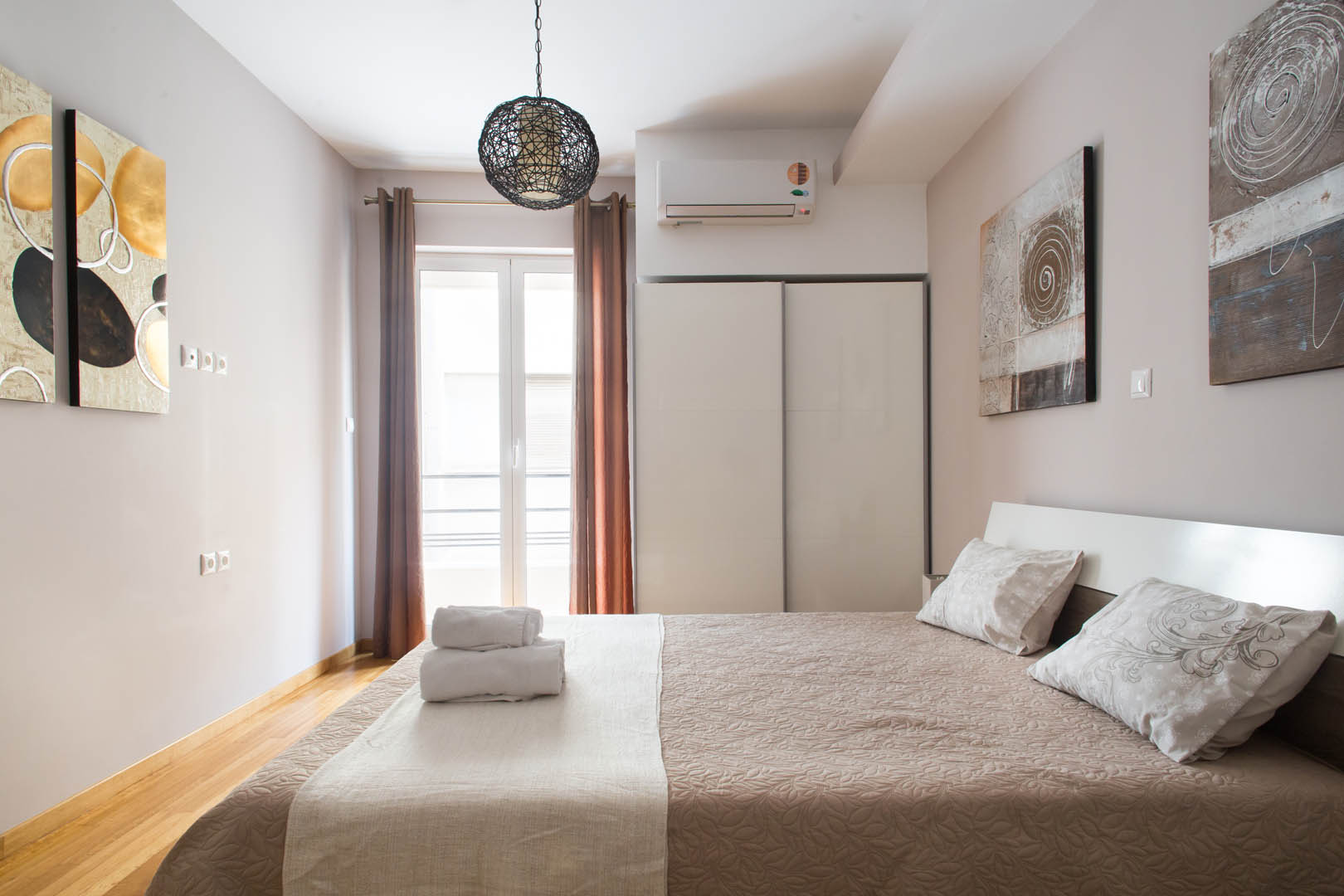 The 82 square meter Hera Apartment, has two bedrooms, each one featuring a double bed, while one of them has a private bathroom with shower and the other one an armchair – bed. In the living room there’s an extra sofa- bed. The apartment also has a fully equipped kitchen and bathroom, a small desk and a balcony.