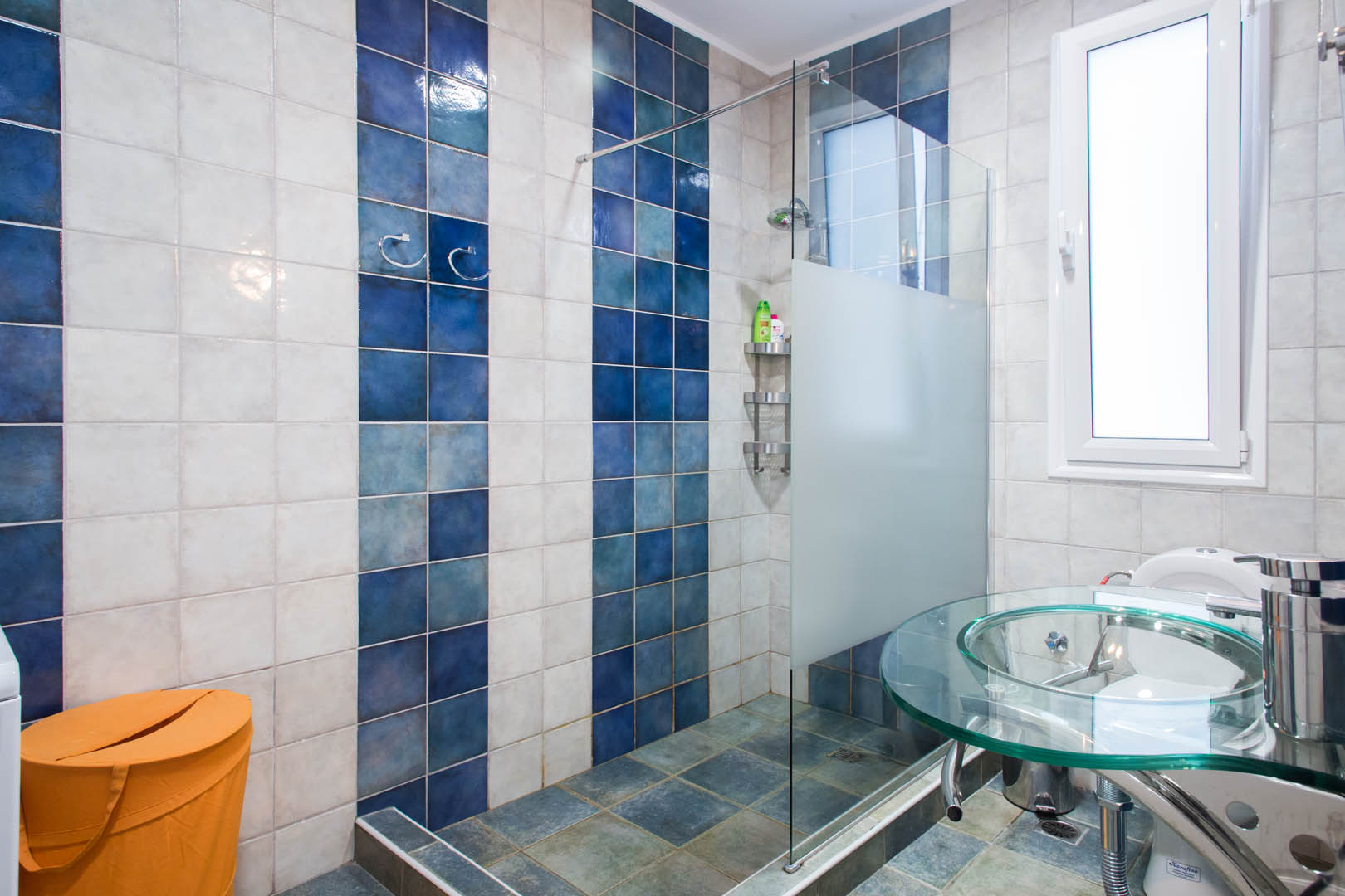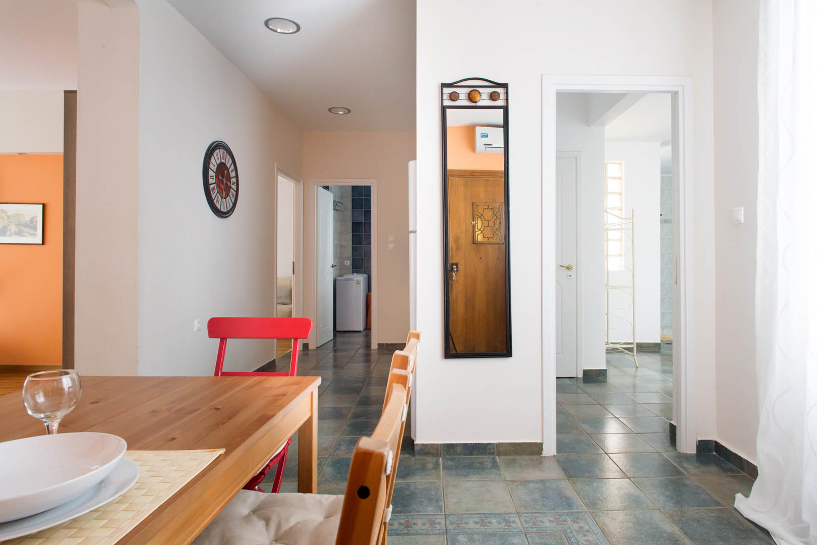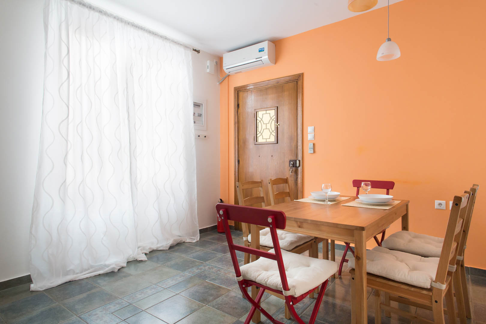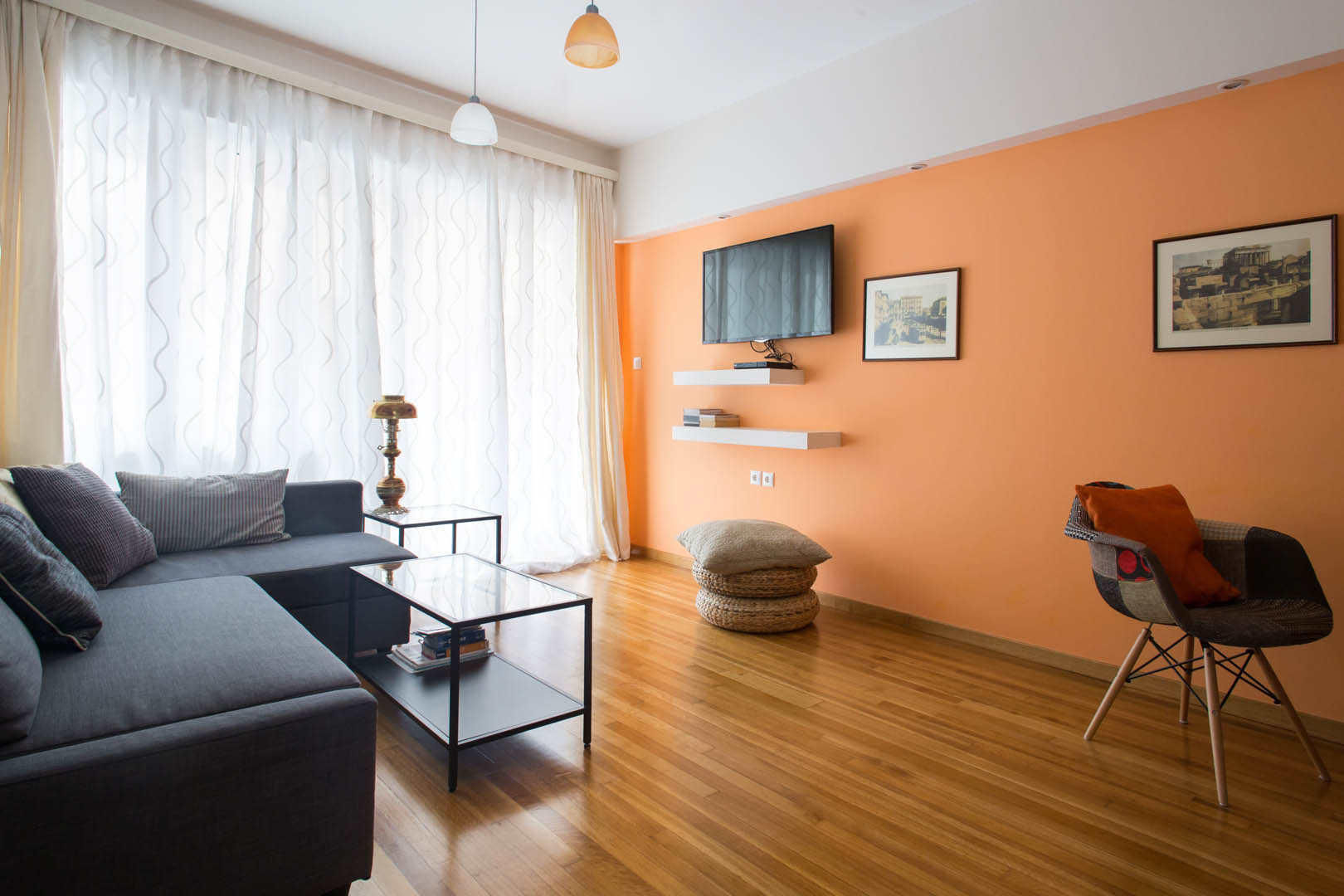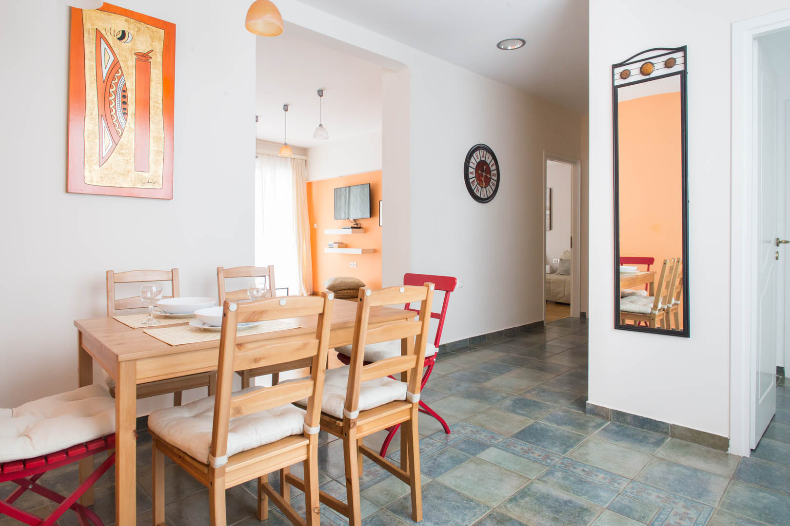 The 82 square meter Hera Apartment, has two bedrooms, each one featuring a double bed, while one of them has a private bathroom with shower and the other one an armchair – bed. In the living room there’s an extra sofa- bed. The apartment also has a fully equipped kitchen and bathroom, a small desk and a balcony.